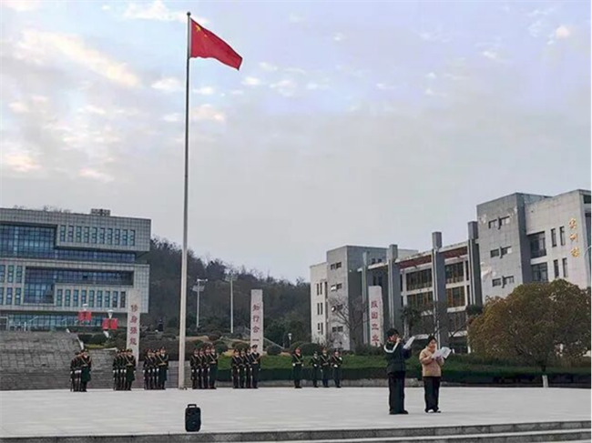师生肃穆,仪式庄严。校国旗护卫队队员身着仪仗礼服整齐列队,迎着初升的太阳,擎旗手肩扛崭新国旗前行,护旗手伴其左右,英姿尽显。当激昂的国歌声响起,五星红旗徐徐升起时,全体师生的目光追随着那抹耀眼的中国红,直至国旗高高飘扬在国旗广场上空。