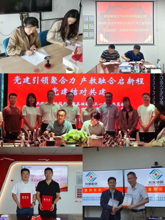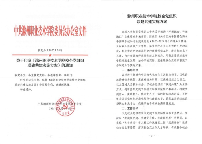 学校坚持以习近平新时代中国特色社会主义思想为指导,深入贯彻落实党的二十大关于推进“产教融合、科教融汇”总体要求和教育部、财政部《关于实施中国特色高水平学校和专业建设计划(2025-2029年)的通知》精神,主动融入滁州市产业布局,拓宽校企合作的广度和深度,将开展校企党组织联建共建纳入年度党建工作重点任务和“双高校”建设党建引领重要内容,按照“共建促党建、共建促合作、共建促发展”思路,党委主要负责同志亲自谋划,研究制定《滁州职业技术学院校企党组织联建共建实施方案》,明确共建目标、共建内容、实施步骤和工作要求,成功推动23个党支部与25个企业党支部精准对接、联建共建,实现全校各基层党组织全覆盖。
