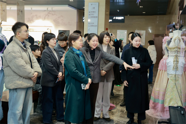 二楼服装设计展区则围绕“弘扬中华传统文化,展现华服时代风采”的主题,通过可视、可触、可感的方式,深度挖掘中华民族璀璨的服饰文明和环保可持续理念进行设计创新,原创了一系列民族风格服饰,引来了众多观众驻足欣赏。
