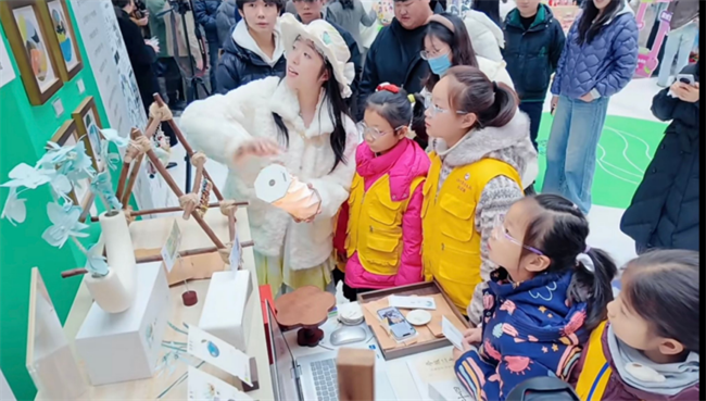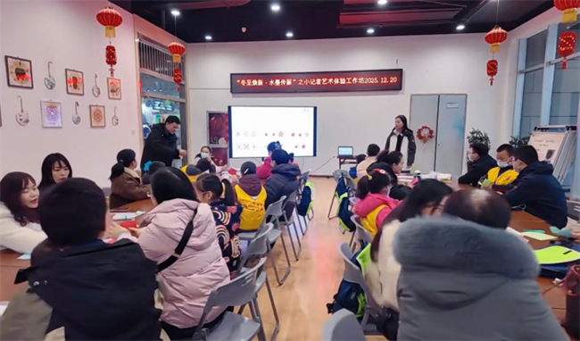 开展前,骨干教师团队在一楼手作教室为滁州广播电视小记者团带来了一场“冬至焕新·水墨传薪”艺术体验工作坊活动,大学生和小朋友们共同感受冬至节气背后的文化意蕴。小记者们在展位跟前沉浸式体验滁州地方文化的“创意之旅”。