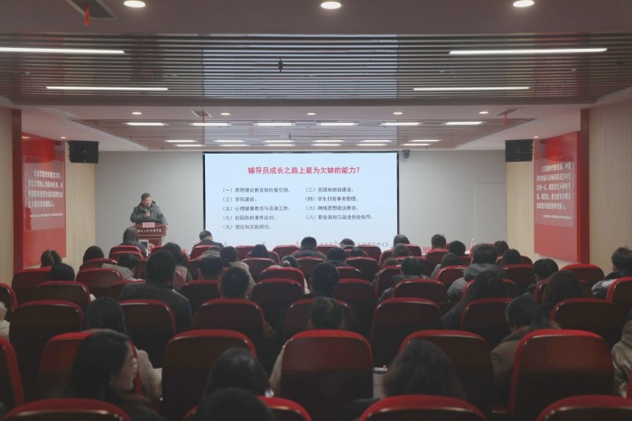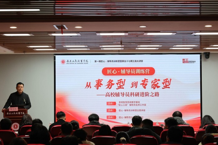 2025年12月24日下午,安徽工商职业学院智慧思政实践教学基地红色报告厅内气氛热烈,学校第一期“匠心·辅导员训练营”暨第五十七期“工商大讲堂”举行。本次活动由学校教育部“匠心工商”辅导员名师工作室牵头承办,并联合安徽理工大学(合肥校区)、安徽国际商务职业学院、安徽新闻出版职业技术学院等共同协办。安徽省教育厅相关处室领导、安徽工商职业学院校领导、四所学校学工部门负责人、部分二级学院党政领导及专职辅导员代表近百人齐聚一堂,围绕辅导员队伍专业化、专家化发展路径,开展深入研讨与交流,共同描绘新时代高职院校思政工作高质量发展新图景。