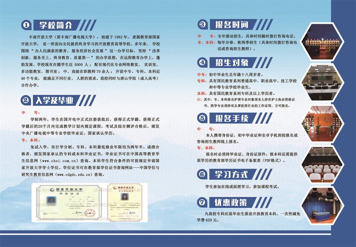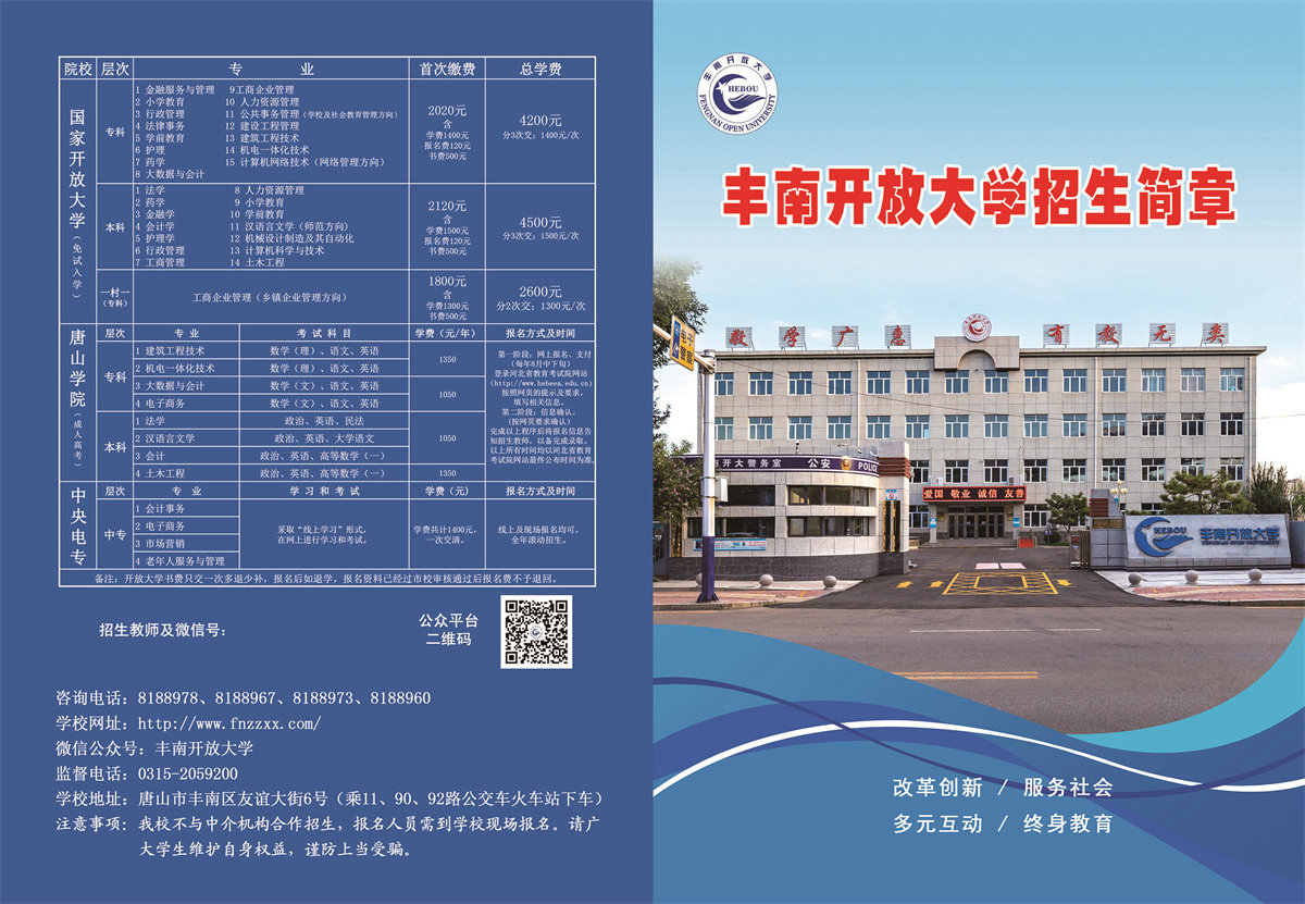 丰南开放大学(原丰南广播电视大学),始建于1982年,隶属教育部国家开放大学,是一所面向全民提供终身学习的开放教育高等学校。多年来,学校围绕“办人民满意的教育,服务经济社会发展”这一办学目标”,坚持“改革创新、服务至上、终身教育、质量第一”的办学思想,在远程教育办学上,蓬勃发展。学校现有在即学生近5000人;配有现代化专业网络教室、实训室、多功能教室、图书室;中、高级在职教师70余人;开设中专、专科、本科、近40个专业,能满足不同行业、人群的需求。我校同时与唐山学院(成人高考)合作办学。