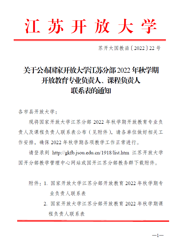 关于公布国家开放大学江苏分部2022年秋学期开放教育专业负责人、课程负责人联系表的通知