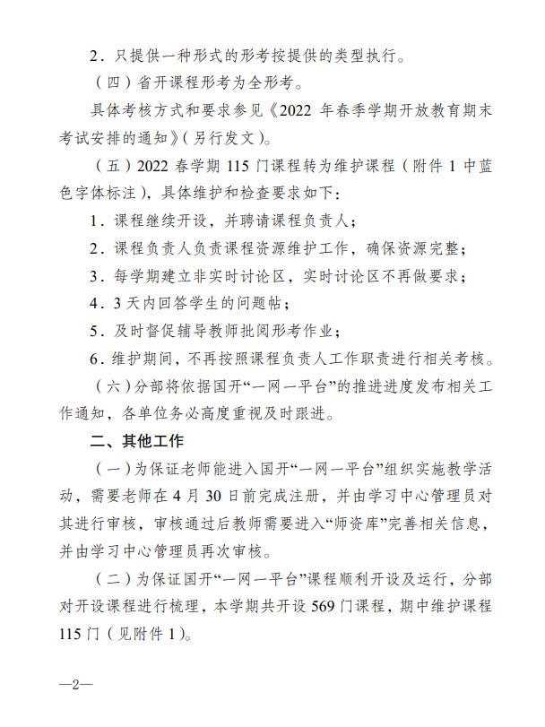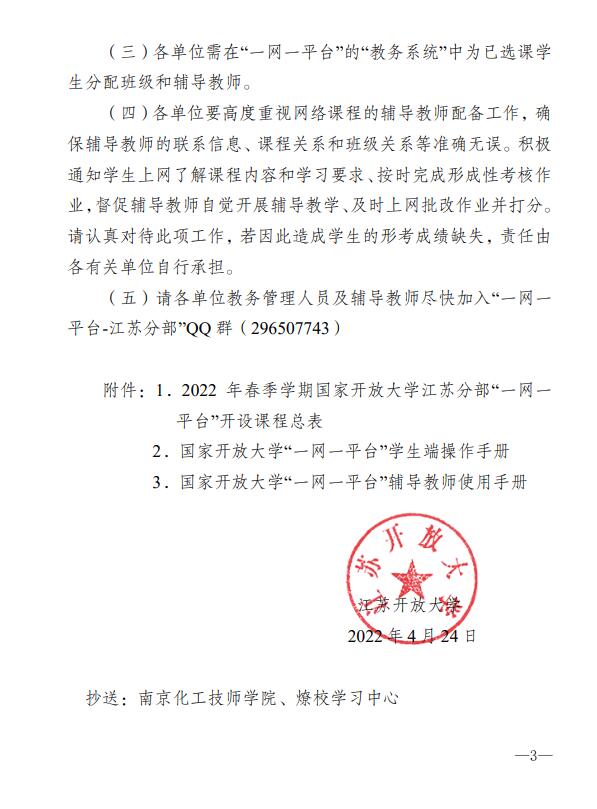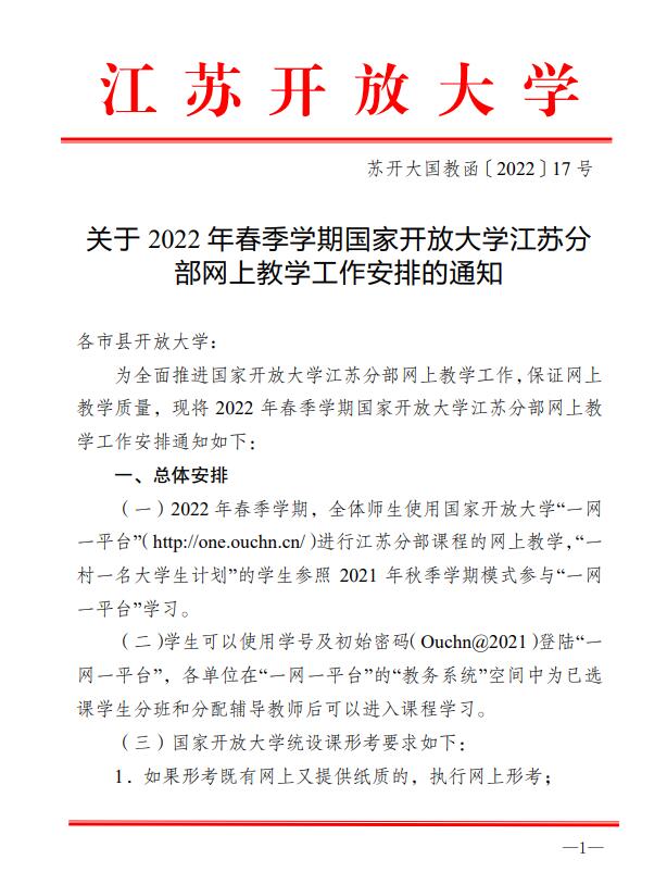 关于2022年春季学期国家开放大学江苏分部网上教学工作安排的通知