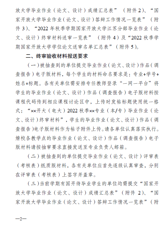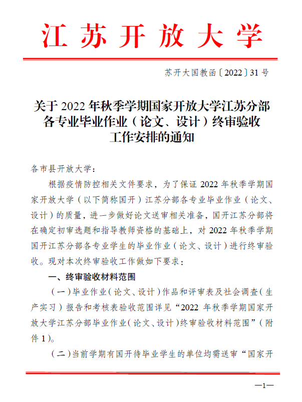 关于2022年秋季学期国家开放大学江苏分部各专业毕业作业(论文、设计)终审验收工作安排的通知