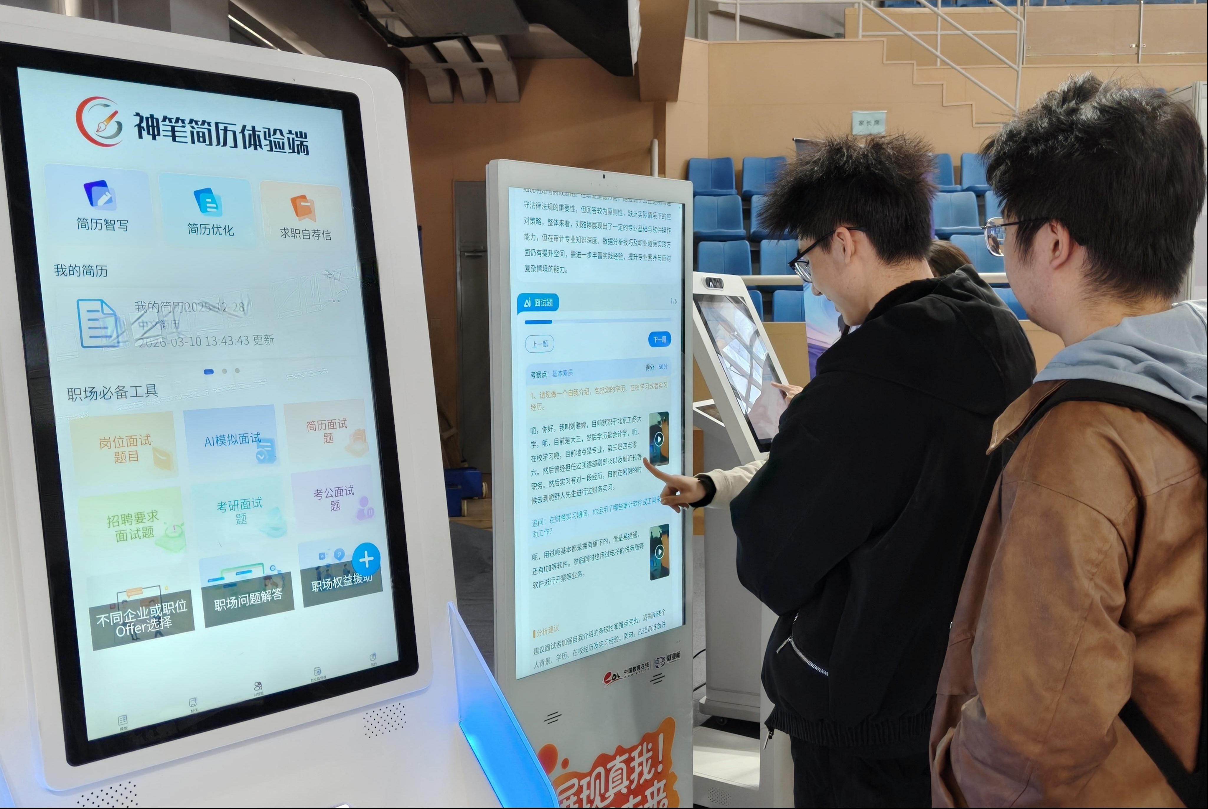 活动现场,学生们踊跃体验各类智能设备的便捷功能:已有简历的学生扫码上传,即可通过简历一体机获得专业的诊断与优化建议,暂无简历的学生则能一键生成贴合求职意向的个性化简历;落地式面试一体机凭借全行业岗位覆盖的数字人面试系统,还原真实面试场景并开展智能追问,帮助学生快速熟悉面试流程、减少临场失误;生涯探索一体机以 7×24 小时 AI 职业咨询师为核心,结合科学测评为学生提供个性化生涯规划指导,生成专属发展方案;就业服务一体机汇集海量招聘资讯、考公考研课程及本场双选会企业信息,实现岗位查询、简历投递一站式服务。