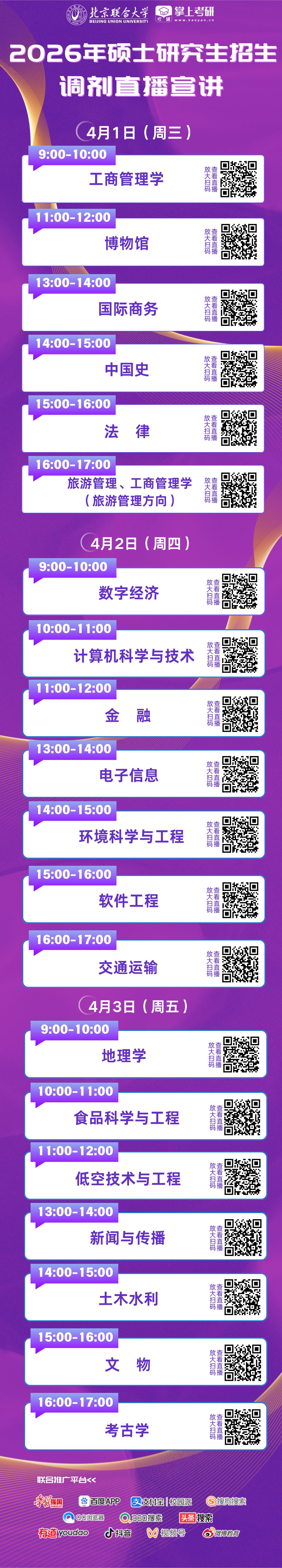 各位考生请注意!为帮助广大考生全面了解2026年硕士研究生招生调剂政策,搭建考生与院系之间的沟通桥梁,北京联合大学将于 4月1日至4月3日 举办 “2026年硕士研究生招生调剂直播宣讲” 活动。