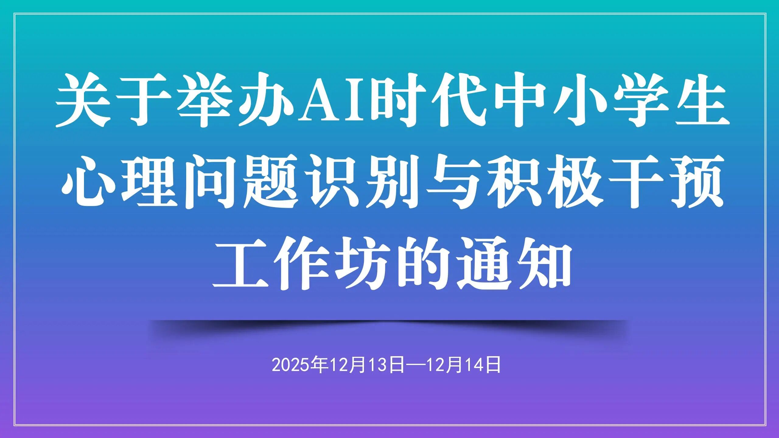 为贯彻落实党的二十届四中全会精神和全国教育大会精神,依据《教育强国建设规划纲要(2024-2035年)》等文件要求,进一步加强学生心理健康教育工作,推动学校心理健康教育向专业化、系统化、规范化方向发展,助力构建“心理育人”协同生态,在中国教育学会、中国民办教育协会的共同指导下,中国现代教育研修中心定于2025年12月举办“心智”系列培训首期工作坊——“AI时代中小学生心理问题识别与积极干预工作坊”。现将有关事项通知如下: