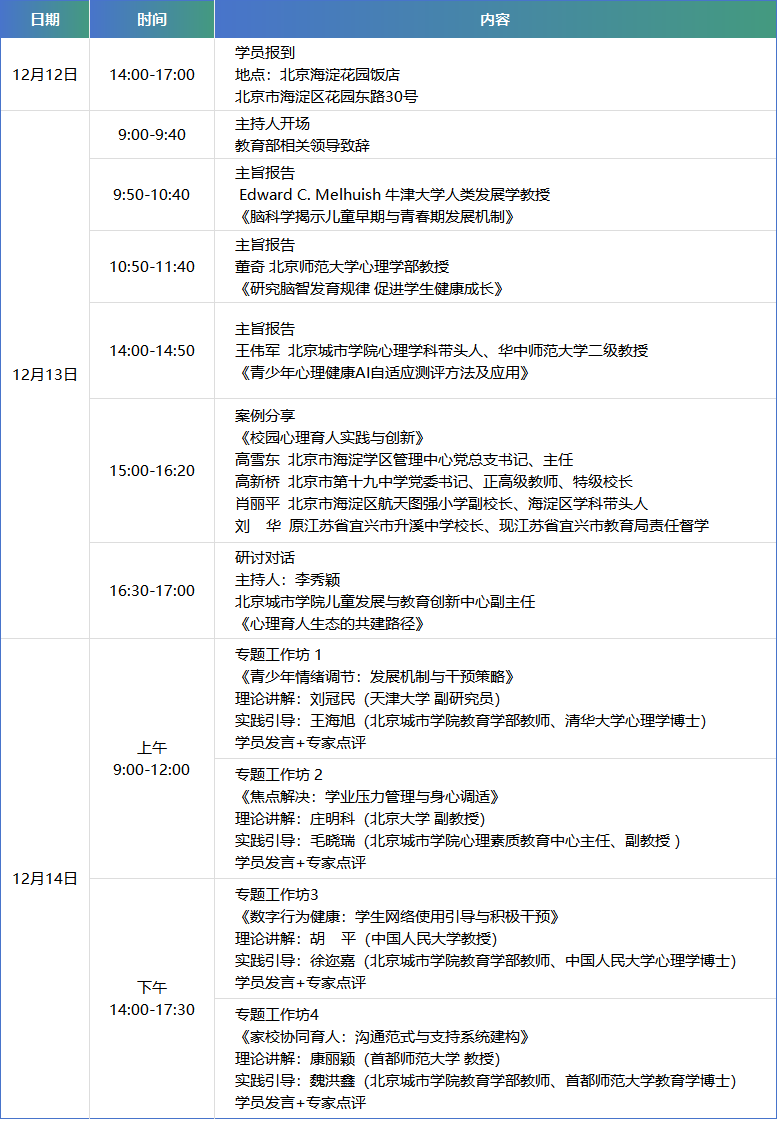 本次培训邀请牛津大学人类发展学教授、英国皇家勋章获得者(OBE)、英国社会科学院院士、北京城市学院客座教授Edward C. Melhuish;北京师范大学心理学部教授、博士生导师,认知神经科学与学习国家重点实验室学术委员会主任,国家杰出青年基金获得者,北京师范大学原校长董奇等权威专家进行主旨报告与专题分享。此外,来自北京大学、清华大学、中国人民大学、首都师范大学等知名高校的资深专家将全程主持专题工作坊,带领学员进行深度研讨与实践演练。授课专家阵容结合实际工作安排可能存在微调,最终将按“同层次、同水平”原则保障培训班质量,核心专家阵容详见附件2。