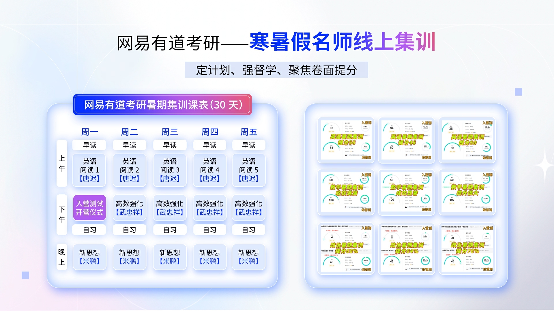 考研备考是长跑,寒暑假无疑是决定胜负的“关键冲刺期”,网易有道考研作为全网首家推出线上集训营的机构,成功将高强度的“高三式”集训模式搬至线上,让学生足不出户,即可实现“弯道超车”。