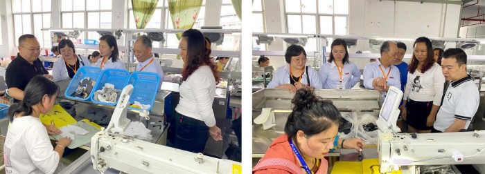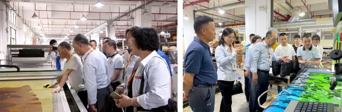 4.智能化车间技术赋能:走进莆田知行合一公司的智能化车间,团队现场讲授“电脑针车”CAM辅助连续模式,促进生产向智能化与自动化方向发展,提高成品标准化程度。同时,详细讲解自动化印线机的智能喷射、热消失油墨、水印线均匀清晰等技术要点,为企业智能化生产提供了坚实的技术支持。