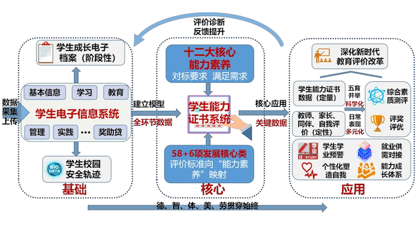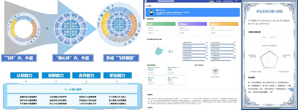 实践中,以“打造全面培养模式下的学生评价”为理念创新,夯实学生评价数据基础,引领学生培养从“知识图谱”向“能力图谱”转变;以“1+1+N for all”的评价体系创新,首创“飞环”模型,形成以学生为主体的全过程全方位成长引导;打造评价应用生态,建立“学生能力证书”,开展学生成长轨迹动态跟踪;以“综合评价数智赋能”的应用创新,依托校内自研慧通大模型,搭建“AI成长助手”,实现从“关于学生”的静态评定到“为了学生”的动态推演,推动评价范式从管理工具转向育人生态。