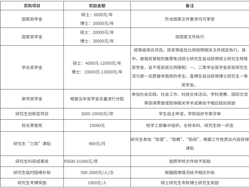 注:表中各类奖助学金仅面向全日制、非定向就业硕士研究生评选,评选细则以学校相关文件及通知为准。