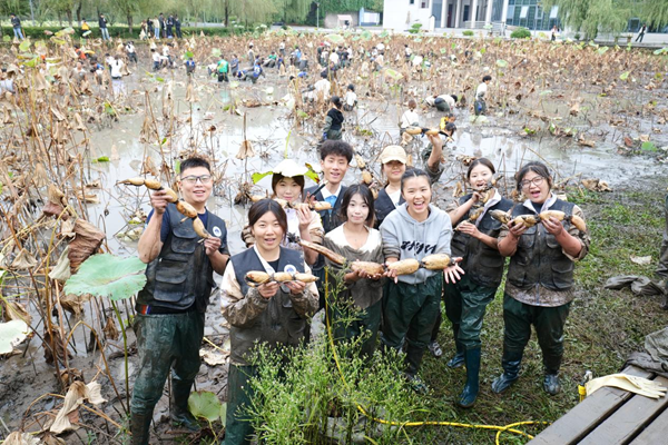 清晨的荷塘边,17支队伍、200余名师生与教职工家庭化身“采藕小分队”,在淤泥中开启了一场别开生面的“挖藕大战”。现场,不时传来兴奋地呼喊:“我挖到一根超大的!”“小心别把藕掰断啦!”欢声笑语中,师生们触摸泥土、认识莲藕,在泥泞中感受劳动的艰辛与收获的喜悦,让荷塘成了最生动的“劳动课堂”。各团队为争夺“年度藕王”使出浑身解数,最终满载而归。活动期间,师生们纷纷用相机定格“藕遇高光”的瞬间,泥点子与笑声齐飞,一个个“限定小泥人”成为这场劳动实践最鲜活的注脚。