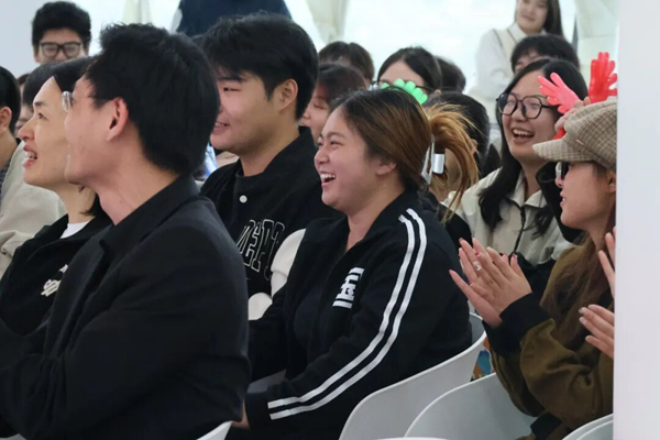 “希望同学们在拿到毕业证、学位证的同时,不必再拿一个‘抑郁证’”,艺术教育中心教师祁杰夫以脱口秀形式开场主持,从公开课趣事到校园日常,轻松诙谐的讲述迅速点燃现场。“同学们从此可以自豪地说,咱们欢声笑语时做学问,笑意盎然地搞研究!”主持人祁杰夫的调侃引来全场掌声和笑声不断。大学生艺术团喜剧队的学生马涛感慨道:“在这个卷不赢又躺不平的时代,我们太需要笑声来化解压力了。”