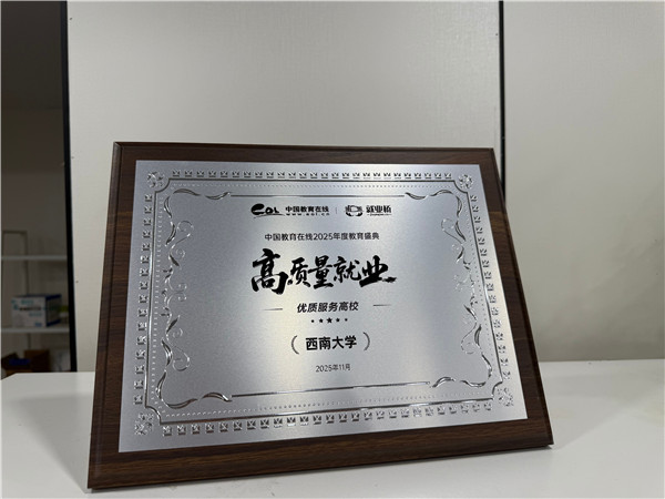 为深入贯彻党中央、国务院关于促进高校毕业生等青年就业创业的决策部署,落实《人力资源社会保障部 教育部 财政部关于做好2025年高校毕业生等青年就业工作的通知》等最新政策精神,挖掘和推广就业工作典型。中国教育在线·就业桥举办了“高质量就业”2025年度教育盛典活动,表彰高校就业工作数智化转型,创新实践的优秀案例,对推动高校就业跨越式发展,汇聚创新动力的榜样单位进行推广。西南大学应邀参选并荣获“2025高质量就业·优质服务高校”。