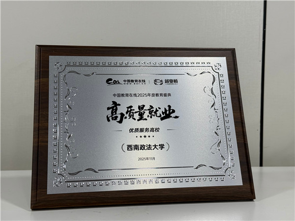 为深入贯彻党中央、国务院关于促进高校毕业生等青年就业创业的决策部署,落实《人力资源社会保障部 教育部 财政部关于做好2025年高校毕业生等青年就业工作的通知》等最新政策精神,挖掘和推广就业工作典型。中国教育在线·就业桥举办了“高质量就业”2025年度教育盛典活动,表彰高校就业工作数智化转型,创新实践的优秀案例,对推动高校就业跨越式发展,汇聚创新动力的榜样单位进行推广。西南政法大学应邀参选并荣获“2025高质量就业·优质服务高校”。