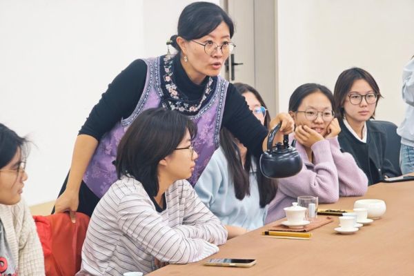 “原来书本里的茶史,能通过一杯茶的冲泡真切感受。”实践环节中,李敏现场演示了茶的冲泡流程,从茶具辨识到注水节奏,逐一细致讲解示范。同学们主动协助分发茶具、分享茶知识,在李敏的指导下体验茶礼。看着茶汤氤氲出醇厚的香气,同学们仿佛也品味到了历史的醇厚与文化的芬芳。中华传统茶文化传播协会组织部副部长杜雪玲也感慨道,这不仅是一次茶艺教学,更是一场文化对话。