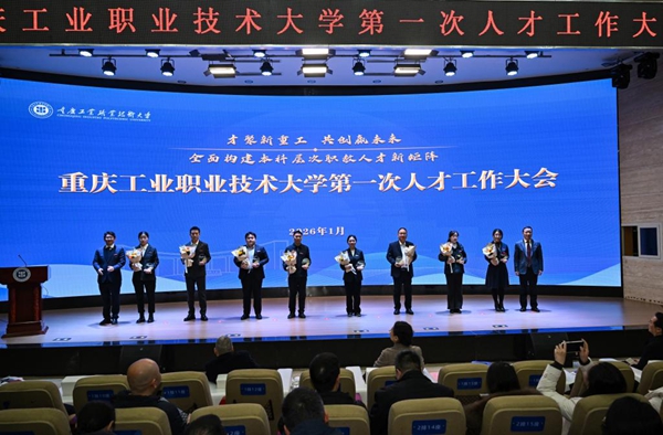 1月23日,重庆工业职业技术大学第一次人才工作大会在两江校区第一学术报告厅召开,南川校区及各二级学院通过云直播设立分会场。本次大会以“才聚新重工 共创赢未来——全面构建本科层次职教人才新矩阵”为主题,是学校升格为本科层次职业技术大学后首次召开的人才工作专题盛会,旨在凝聚人才共识、擘画发展蓝图,为学校高质量发展注入强劲动能。重庆市委教育工委委员、市教委副主任金玲,市人社局二级巡视员叶盛平,市教委人事处处长李斌、副处长余冠军,市人社局人力资源流动管理处处长王军国等出席会议。学校党委书记郭天平,党委副书记、校长周传德等全体校领导,科级以上干部及教师代表参加会议。会议由党委常委、副校长李雷主持。