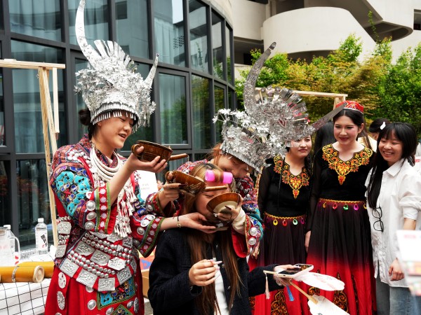 在非遗体验区,扎染、藏巴珠制作、拓印、黎族传统纺染织绣技艺、苗族银饰制作等多项非遗项目吸引了大量师生驻足参与,竹竿舞、踩高跷等集体互动项目也让师生们纷纷上手体验,现场氛围热烈欢快。土家族油粑粑、侗族米酒等民族特色美食的制作工艺同步在现场展示,“高山流水”敬酒仪式更是成为本次活动的亮眼亮点,吸引了众多师生驻足观看与参与。