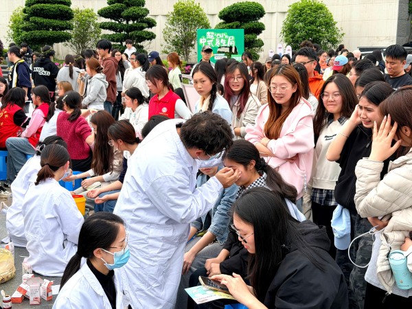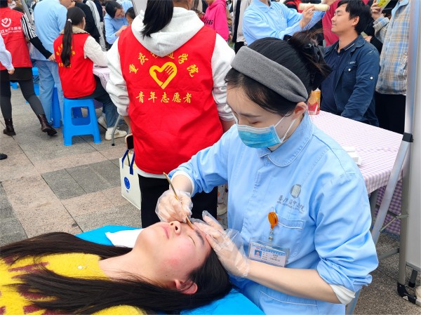 当日下午两点,重庆移通学院綦江校区正大门广场化身热闹的中医文化集市,“义诊区”“药膳区”“节气DIY区”三大特色体验区有序铺开。綦江区中医院派出12位中医专家及50余名医护人员,现场提供义诊咨询、推拿按摩、艾灸调理、耳穴压豆等中医适宜技术服务,为参与者送上专业的健康指导。风筝DIY、柳编花环、手作青团等体验项目,将清明节气养生知识与传统民俗相结合,让参与者在动手实践中感受中医文化的趣味性与实用性。