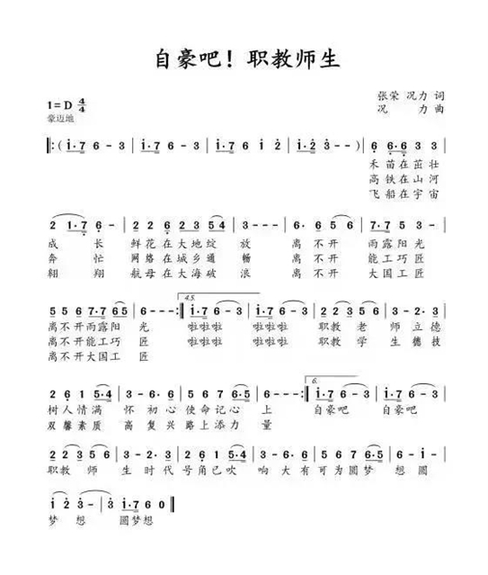 前不久,习近平总书记对职业教育工作作出重要指示强调,在全面建设社会主义现代化国家新征程中,职业教育前途广阔、大有可为。为广泛深入学习宣传贯彻习近平总书记关于职业教育的重要指示精神,进一步激励职业教育发展,增强职教师生的自豪感和使命感。日前,由国家督学、重庆市职业教育学会会长张荣与重庆职业教育学会驻会副会长兼秘书长况力共同作词,况力谱曲,并由重庆文化艺术职业学院青年教师梁皓和沈忱唱录的《自豪吧!职教师生》公益歌曲发布。