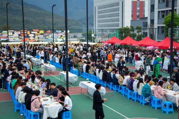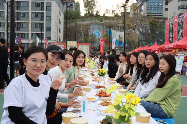 30个风格特异的学生社团展示、6个喜闻乐见的美食互动体验点、2个重庆市非物质文化遗产(东溪豆腐乳、东溪黑鸭)、600余份美食、小吃餐点的长桌,吸引了千余人在现场参与,一同享乐!