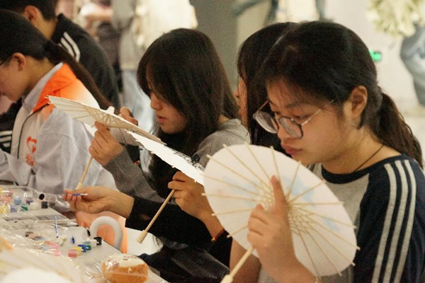 在传统工艺体验区,参与者可领取空白油纸伞及绘画工具进行自由创作。师生们以绘制山水、卡通形象和书写寄语等形式,在艺术创作中实现压力释放与情绪表达。