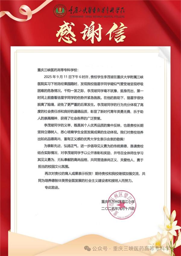 近日,重庆三峡医药高等专科学校收到一封来自望江小学及被救学生家长的感谢信,赞扬该校中医学院2023级学生李茂玻见义勇为的善举,展现了新时代医学生的责任担当和三峡医专致力于培养有担当、有素养的医药人才的教育成果。