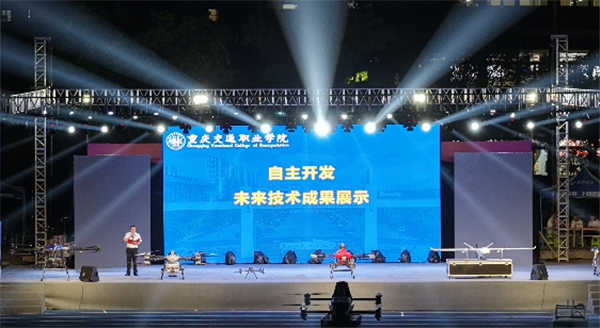 作为扎根重庆、深耕交通领域的职业院校,重庆交通职业学院立足“数字制造、数字建造、数字教育、数字农业、数字矿山”五大生态体系理念,近年来积极推动师生共创产教融合成果。当晚的展示会上,集中呈现了学院在低空经济、数字制造、数字建造、数字教育等领域的最新技术成果。