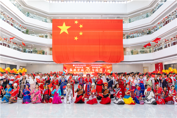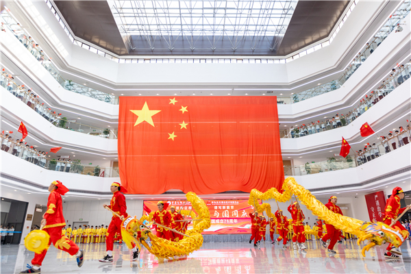 活动现场,一面巨幅五星红旗缓缓展开,鲜红的底色与师生手中挥舞的小国旗交相辉映,瞬间点燃全场热情。非遗展演《龙腾狮跃贺华诞》,“传统技艺+爱国主题”的创新表达,既让年轻学子感受到非遗文化的生命力,更让爱国主义教育在文化传承中落地生根;身着56个民族传统服饰的学子们带来的舞蹈《爱我中华》,则以生动的视觉语言诠释了“民族团结一家亲”的深刻内涵;“我和我的祖国,一刻也不能分割……”当《我和我的祖国》的旋律响起,全场师生齐声合唱,同学们挥舞国旗汇聚成醒目而庄重的“76”字样,象征新中国76年的光辉历程与青年一代的使命担当。