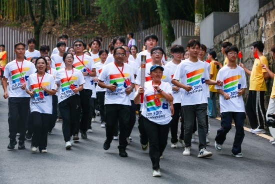校庆系列活动首先以“虚实双火炬”传递行动拉开序幕,汇聚了来自全国各地和海外站点的“火种”,200名校友、百名国际学生及师生代表的接力奔跑,生动诠释了学校三十年奋斗的信念与步伐。当晚,海内外校友欢聚一堂,共叙同窗情谊,彰显了学校大家庭的凝聚力。