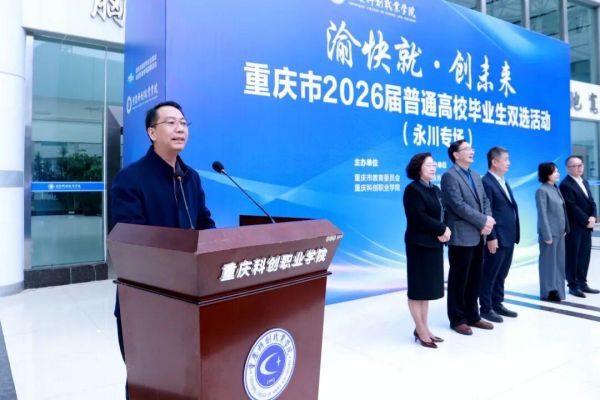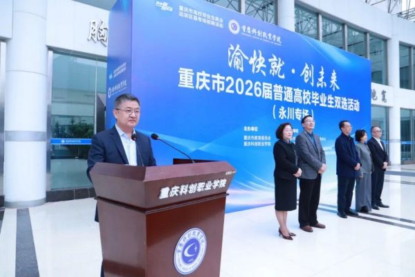 10月29日,“渝快就·创未来”重庆市2026届普通高校毕业生双选活动(永川专场)在重庆科创职业学院举行。活动当日,重庆市学生就业与创新创业服务中心副主任徐珮杰一行亲临活动现场指导,重庆市永川区人力资源和社会保障局党委委员、区就业和人才中心主任张晓东,重庆太平洋精工科技有限公司常务副总经理沙光荣,学校校长何弦博士、党委书记董刚,副校长田一平、殷朝华出席开幕式,副校长刘鸿飞主持开幕式。各二级学院负责人、辅导员、专业教师及2026届毕业生参加活动。