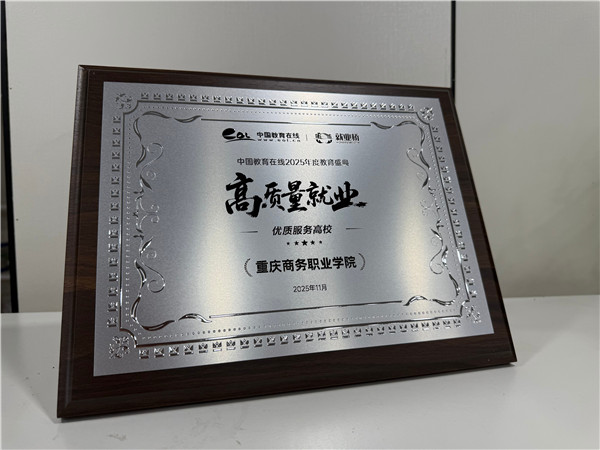 为深入贯彻党中央、国务院关于促进高校毕业生等青年就业创业的决策部署,落实《人力资源社会保障部 教育部 财政部关于做好2025年高校毕业生等青年就业工作的通知》等最新政策精神,挖掘和推广就业工作典型。中国教育在线·就业桥举办了“高质量就业”2025年度教育盛典活动,表彰高校就业工作数智化转型,创新实践的优秀案例,对推动高校就业跨越式发展,汇聚创新动力的榜样单位进行推广。重庆商务职业学院应邀参选并荣获“2025高质量就业·优质服务高校”。