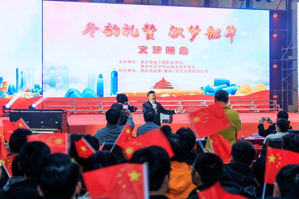 “冬韵礼赞 织梦韶华”文艺晚会融合器乐、舞蹈、声乐、戏曲等多种形式,既有《山丹丹花开红艳艳》《走向复兴》的激昂合奏,朝鲜族风情的《桔梗谣》舞步轻快,也有《女儿情》的柔美伞舞;《船工号子》一开口就带出巴渝山水的灵秀,《黄杨扁担》更是用熟悉的川渝调子拉满亲切感;《保卫黄河》《怒吼吧!黄河》的磅礴合唱与全场合唱《歌唱祖国》的嘹亮歌声交织,师生们挥舞着手,把对祖国的热爱唱进了冬日的夜空。