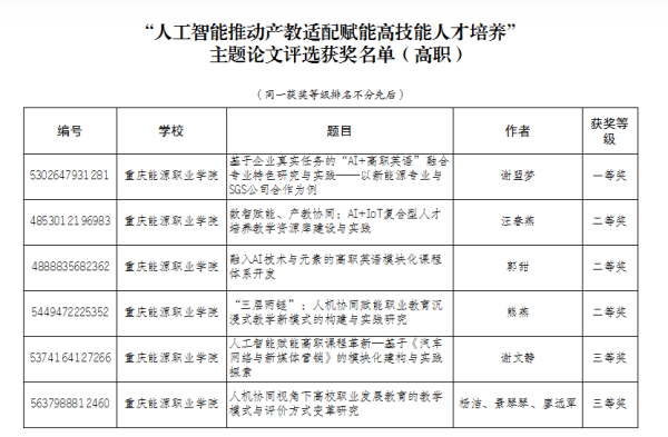 2026年1月4日,重庆市教育科学研究院公布了“人工智能推动产教适配赋能高技能人才培养”主题论文及典型案例评选结果。此次评选中,重庆能源职业学院获11项奖项。其中,主题论文类一等奖1项、二等奖3项、三等奖2项;典型案例类二等奖3项、三等奖2项。