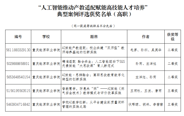此次获奖项目数量多、覆盖广、质量高,是重庆能源职业学院深耕“人工智能+职业教育”领域、深化产教适配改革的重要成果,也标志着学校在人工智能赋能高技能人才培养方面的探索与实践获得了认可。