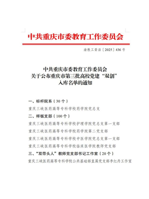 近日,中共重庆市委教育工委印发《关于公布重庆市第三批高校党建“双创”入库名单的通知》(渝教工委函〔2025〕436号),重庆三峡医药高等专科学校药学院党总支立项标杆院系,护理学院党总支第一支部、药学院党总支第二支部、中医学院党总支第一支部、临床医学学院党总支教师支部等4个支部立项样板支部,公共基础部直属党支部李红丹工作室立项“双带头人”教师党支部书记工作室。本次党建成果立项数较上批次增长50%,学校党建“双创”成果立项量稳居全市第一方阵,位列全市高职高专院校第1名。