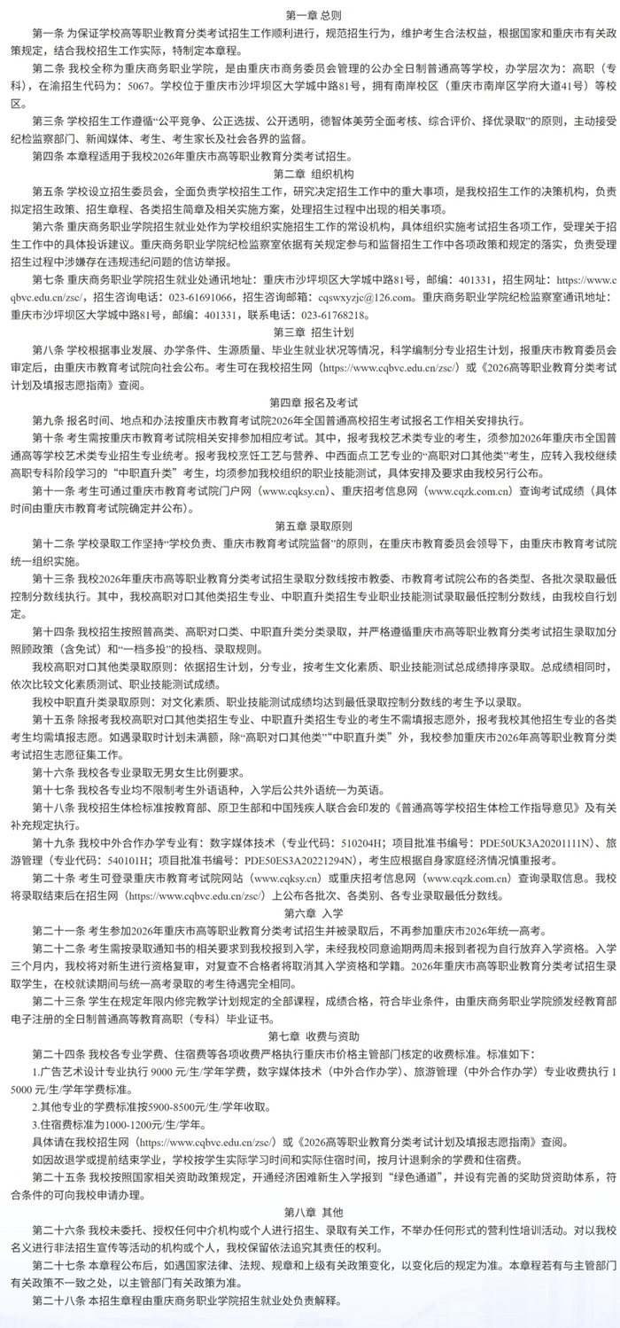 重庆商务职业学院2026年重庆市高等职业教育分类考试招生章程