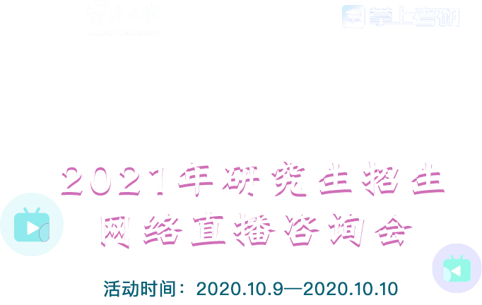 为增进广大考研学子对高校的了解,建立多方位的沟通渠道,云南大学联合中国教育在线举办2021年研究生招生网络直播咨询会。届时云南大学各学院招生老师会进入直播间,与考生进行交流。敬请关注!