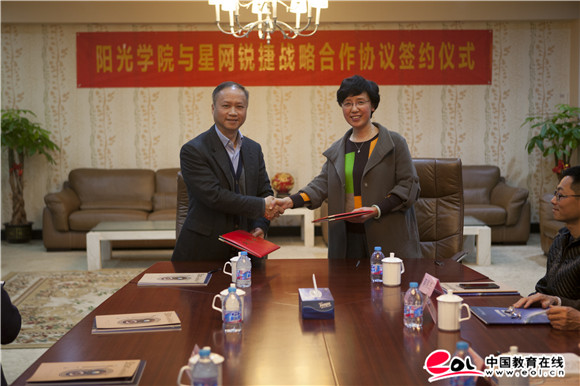 中国教育在线讯 3月13日下午,阳光学院与福建星网锐捷通讯有限公司签订战略合作协议。校企双方将主要围绕八个方面展开合作:一是共建实训基地,构建符合基于产教融合专业建设配套的真实工作场景;二是共同制定人才培养方案和教学课程,使培养的人才适应市场的需求;三是共同建设师资队伍,培养既有丰富实践经验又能从事教学工作的“双师型”教师;四是共同指导学生实习实训、实践活动;五是共同开发科研项目,对双方成果进行推广;六是共同指导竞赛项目,健全“以赛促学”人才培养体系;七是组建“星网锐捷”冠名班,探索“3+1”人才培养模式;八是成立“阳光--星网”产业学院,推进产校融合协同育人。