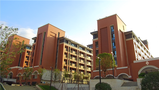 沿靠中国举重福建马江基地一侧的入口进入,只见建筑群错落有致地分布在山体之上,青瓦红墙的楼宇外观配以全灰色铝合金玻璃窗及局部玻璃幕墙,传统又不失浪漫,时尚大气又颇具学府气息,远远望去,宛若一座小型的“布达拉宫”。
