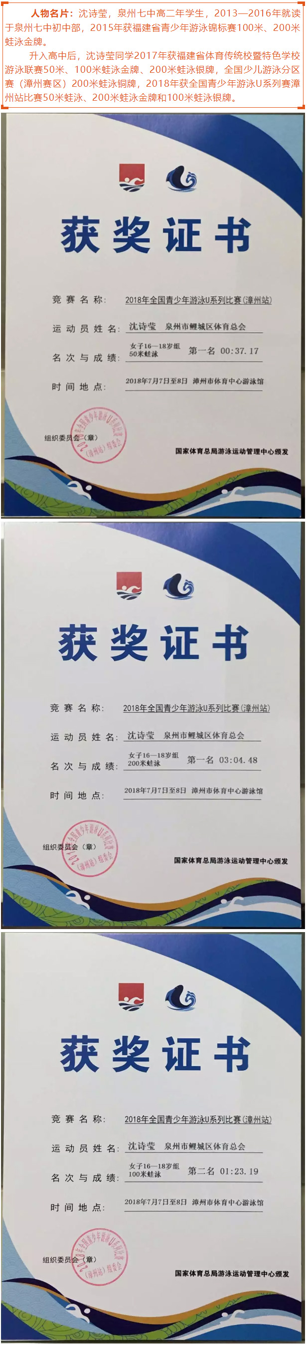 泉州七中17岁女孩勇夺全国青少年游泳U系列比赛2金1银