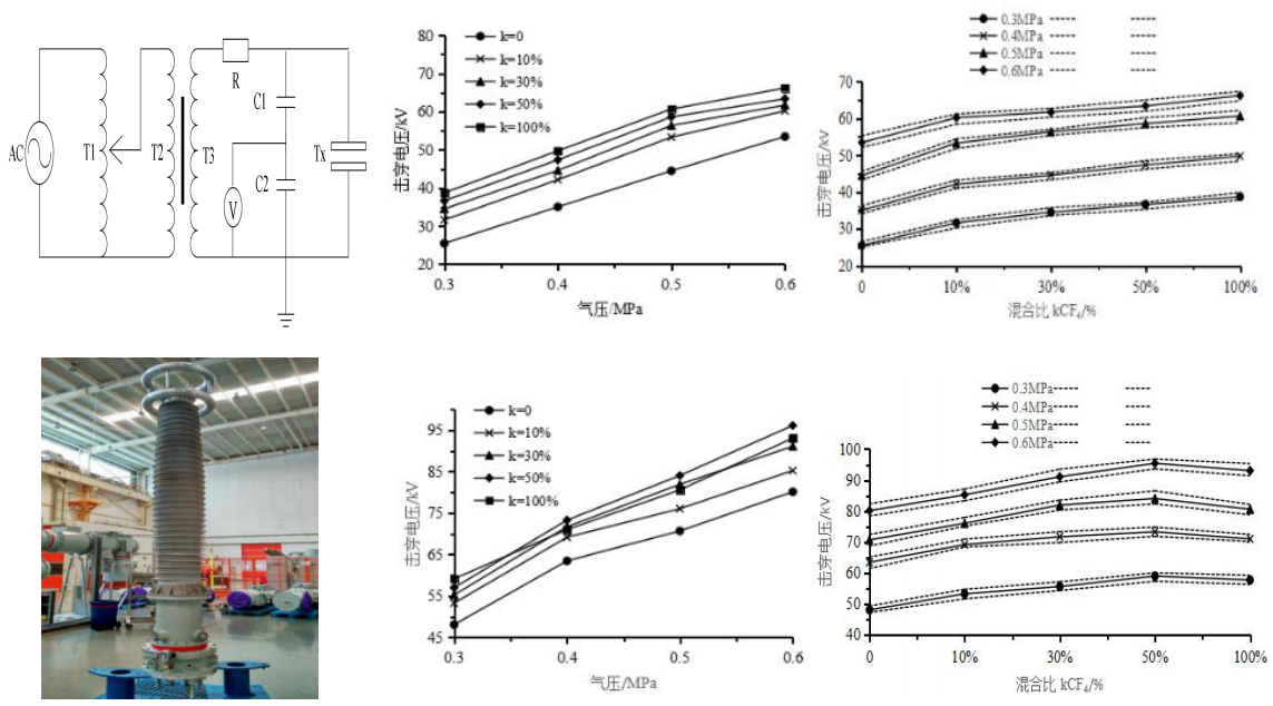 图 1 试验装置及接线图 图 2 均匀与稍不均匀电场下 CF4/CO2 混合气体的工频击穿特性变化曲线
