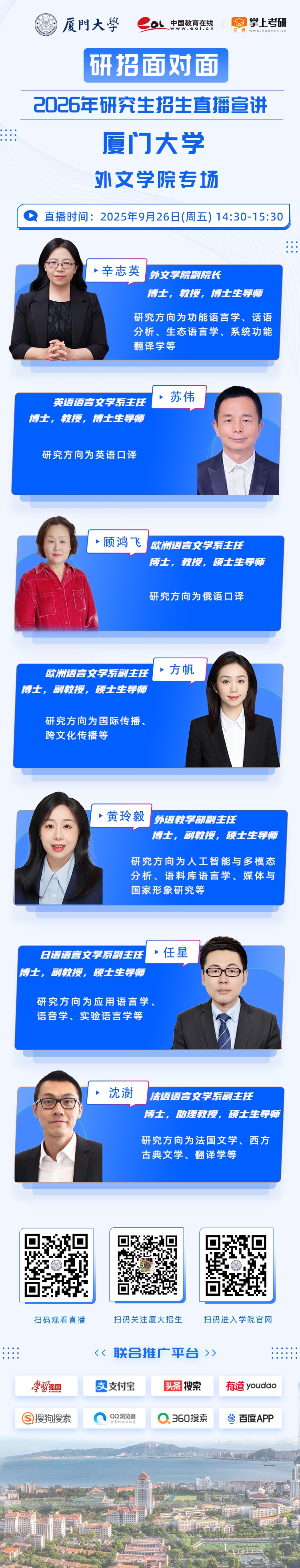 直播预告|10月15日,2026年厦门大学·外文学院研究生招生直播咨询会开讲