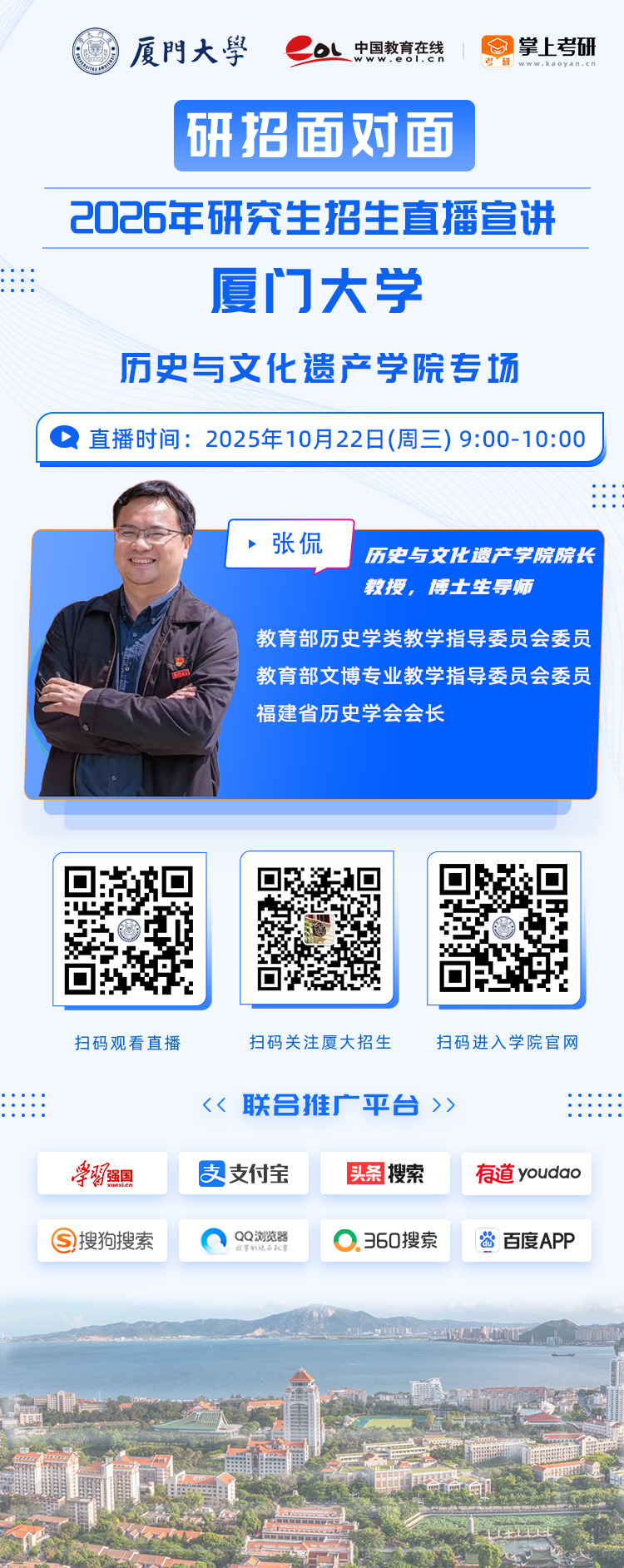 直播预告|10月22日,2026年厦门大学·历史与文化遗产学院研究生招生直播咨询会开讲