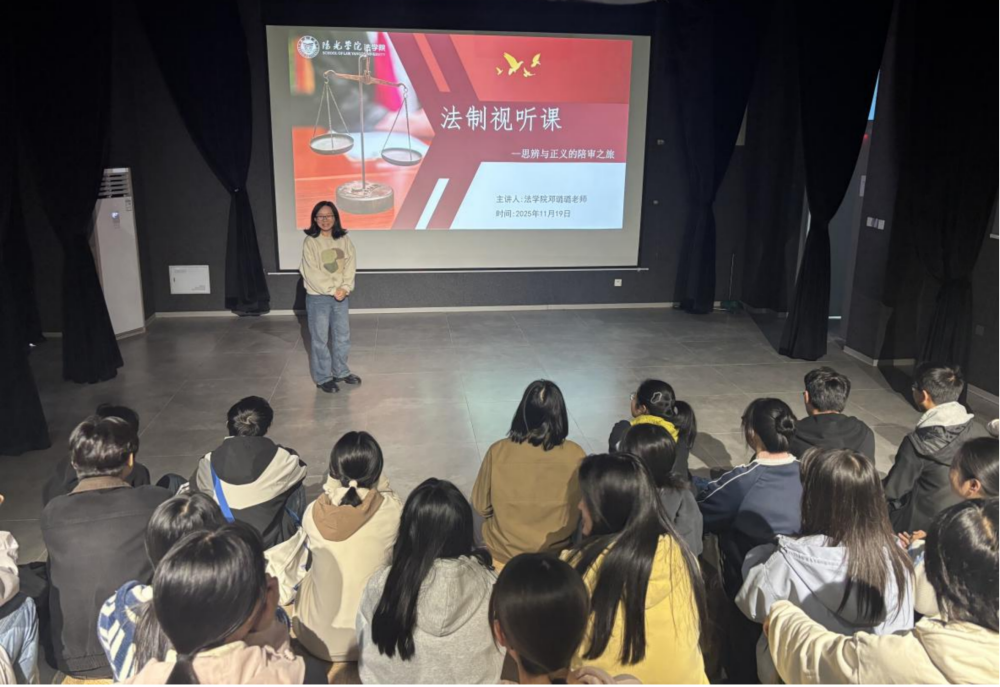 在后续的“法治视听课”中,邓璐璐老师带来了电影《十二怒汉》的精彩分享。她引导学生思考公正、平等、民主等价值观在司法审判中的重要性,让学生们明白法律不仅仅是冰冷的条文规定,更是维护社会公平正义的坚实基石。从专业教育角度出发,邓璐璐老师详细分析了影片中陪审团制度的运作过程,以及陪审员们在讨论案件时所运用的逻辑推理和证据分析方法。她鼓励学生们学习影片中陪审员们严谨的思维方式和求真的态度,提高自己在法律实践中的分析和判断能力,为未来从事法律工作打下坚实的基础。
