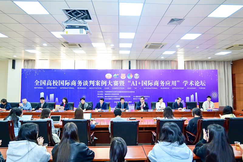 同期举办的“AI+国际商务应用”学术论坛同样精彩纷呈。论坛开幕式上,举行了“AI+国际商务联合研究中心”揭牌仪式,标志着赛事组委会与学院的合作迈入新阶段。在论坛主旨演讲环节,董中奇、朱晓姝、韦樟清三位专家分别围绕“人工智能时代的跨境商务挑战”“走进拉美,谈判中国”“耕耘‘AI+国际商务'试验田,培育新时代跨界商业精英”等主题分享了高质量推进“AI+国际商务”融合发展的真知灼见。现场,3位专家作为全国高校国际商务谈判案例大赛获奖团队作优秀案例分享,5位专家开展“‘AI+国际商务’的机遇与挑战”圆桌论坛,深入探讨了人工智能与国际商务应用的创新融合。