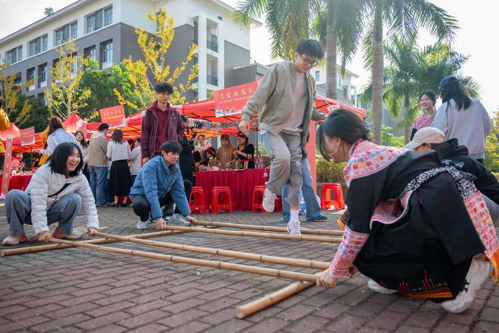 图:协和学子们现场体验畲族竹竿舞,沉浸式体验少数民族风情 陈子瑶(摄)
