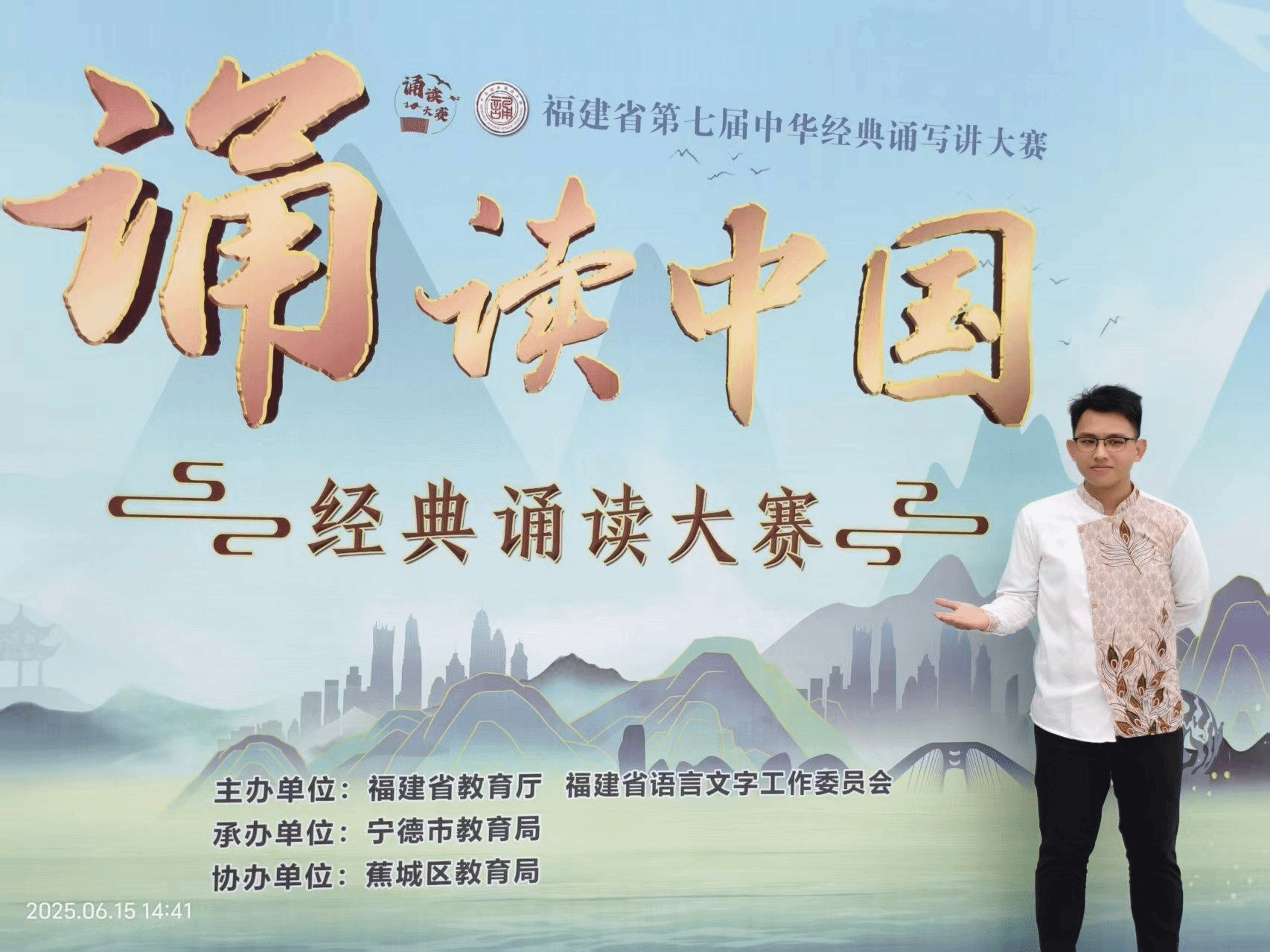 近日,福建省教育厅、福建省语言文字工作委员会公布第七届中华经典诵写讲大赛获奖名单。集美大学留学生STEVEN EFRIANTO CHRISTIAN(中文名:陈福明)在张霄、叶剑锋两位老师精心指导下,凭借对李白诗作《将进酒》的精彩演绎,荣获大赛留学生组省级二等奖。